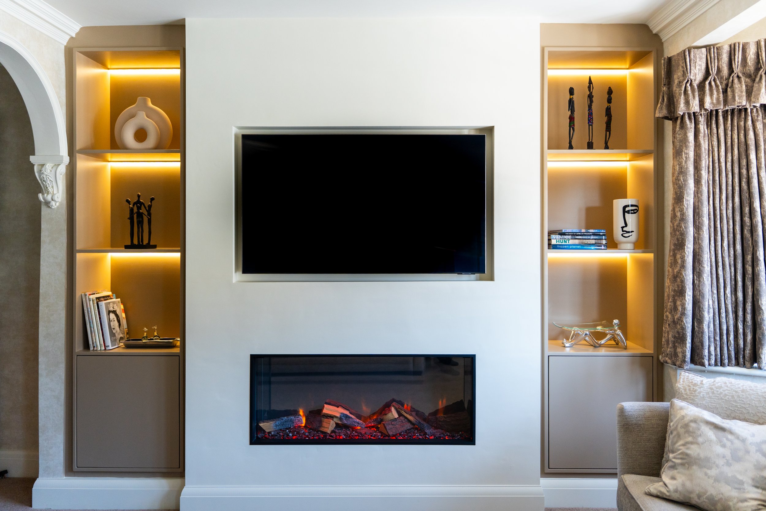 Bespoke lighting features and stylish cupboards are thoughtfully recessed into the alcoves, enhancing the overall ambiance, while a contemporary fireplace is elegantly set at the center of the chimney breast, providing both warmth and a striking visual element.
